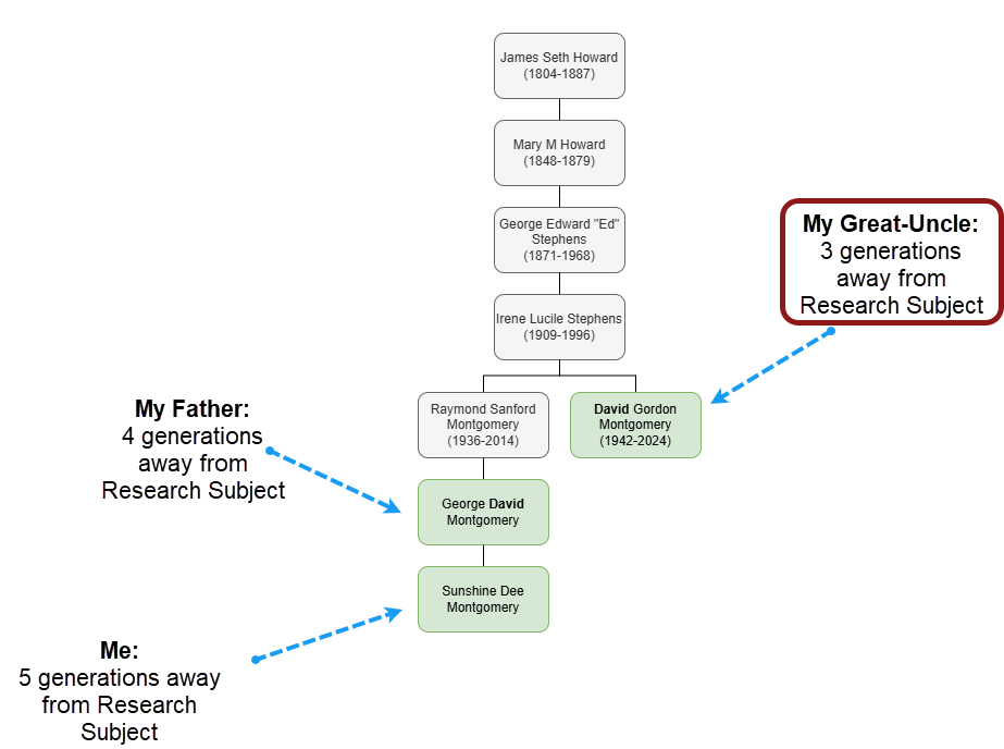 I needed to determine who was the best person to take an autosomal DNA (atDNA) test to help answer my research question. I had multiple kits to chose from, including my own, but using my Great-Uncle David’s match list (he will just be called “Uncle David” from here on out) was the best option since he was the closest generationally to my research subject, Seth Howard.