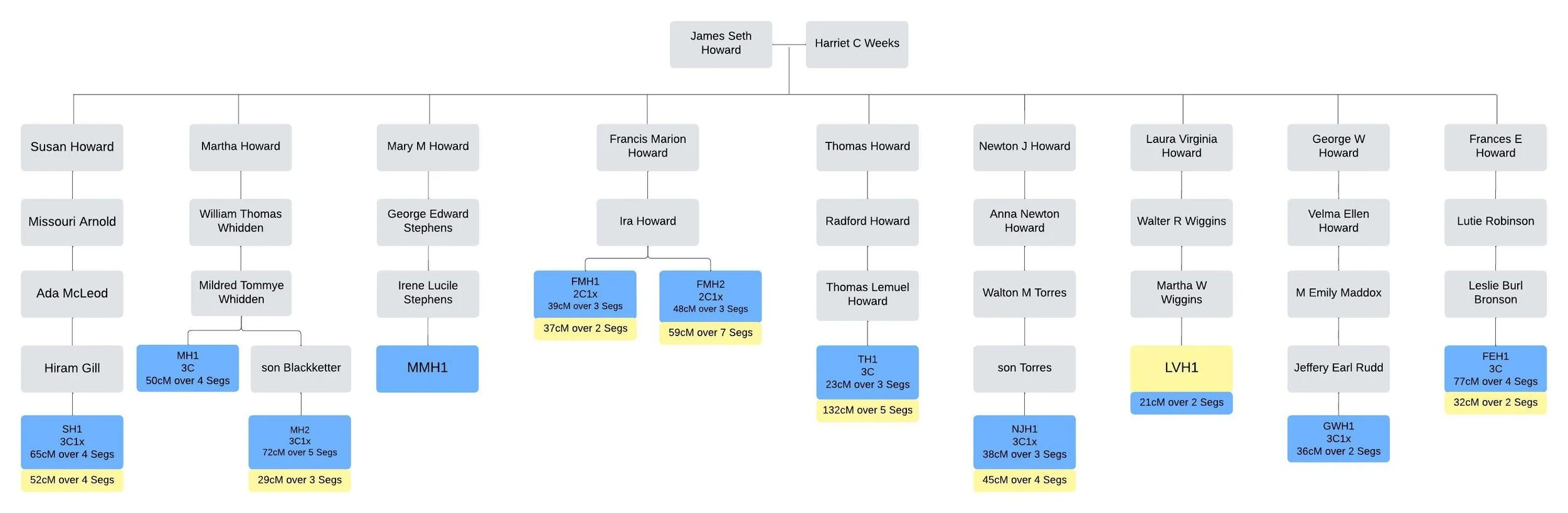 The line of descent from Seth Howard and Harriet C. Weeks for eleven test-takers is shown in blue and yellow. The test-taker names were anonymized to protect their privacy. The centimorgan (cM) values shared between David Gordon Montgomery (denoted as “MMH1”) and each documented test-taker are shown in the blue rectangles. The cM values shared between Mary Romeo (1942–2017) (denoted as “LVH1”) and each documented test-taker are shown in the yellow rectangles.
