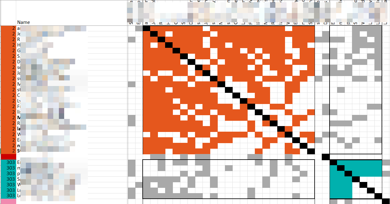 The next step was to run a “Collin-Leeds Method” (CLM) clustering of the matches extracted above. CLM clustering works by identifying those matches who are in common with each other and with the test-taker, and then grouping those matches into clusters when multiple people appear in one another’s ICW lists. Finally, the program color-codes each cluster, which often corresponds to a single ancestral line.